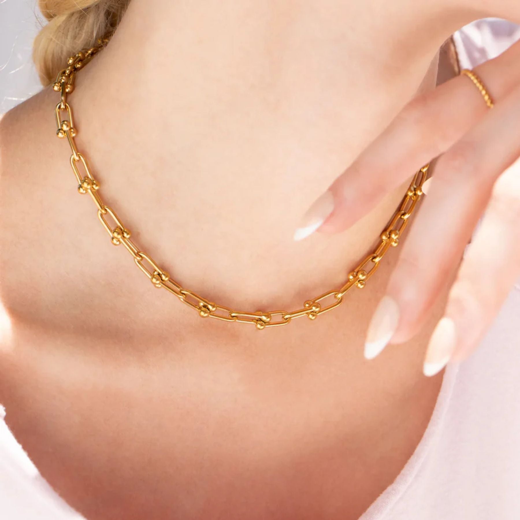 Make a statement with our designer, 18K Gold PVD Stainless Steel Hardware Necklace, created for those who love bold, edgy elegance. Featuring a sleek, industrial-inspired hardware chain design, this piece adds a touch of modern luxury to any look. Crafted from high-quality stainless steel with a durable 18K gold PVD coating, this necklace is waterproof, tarnish-resistant, and hypoallergenic, ensuring long-lasting shine and wearability. Whether worn solo or layered, it’s the perfect accessory for effortless style.