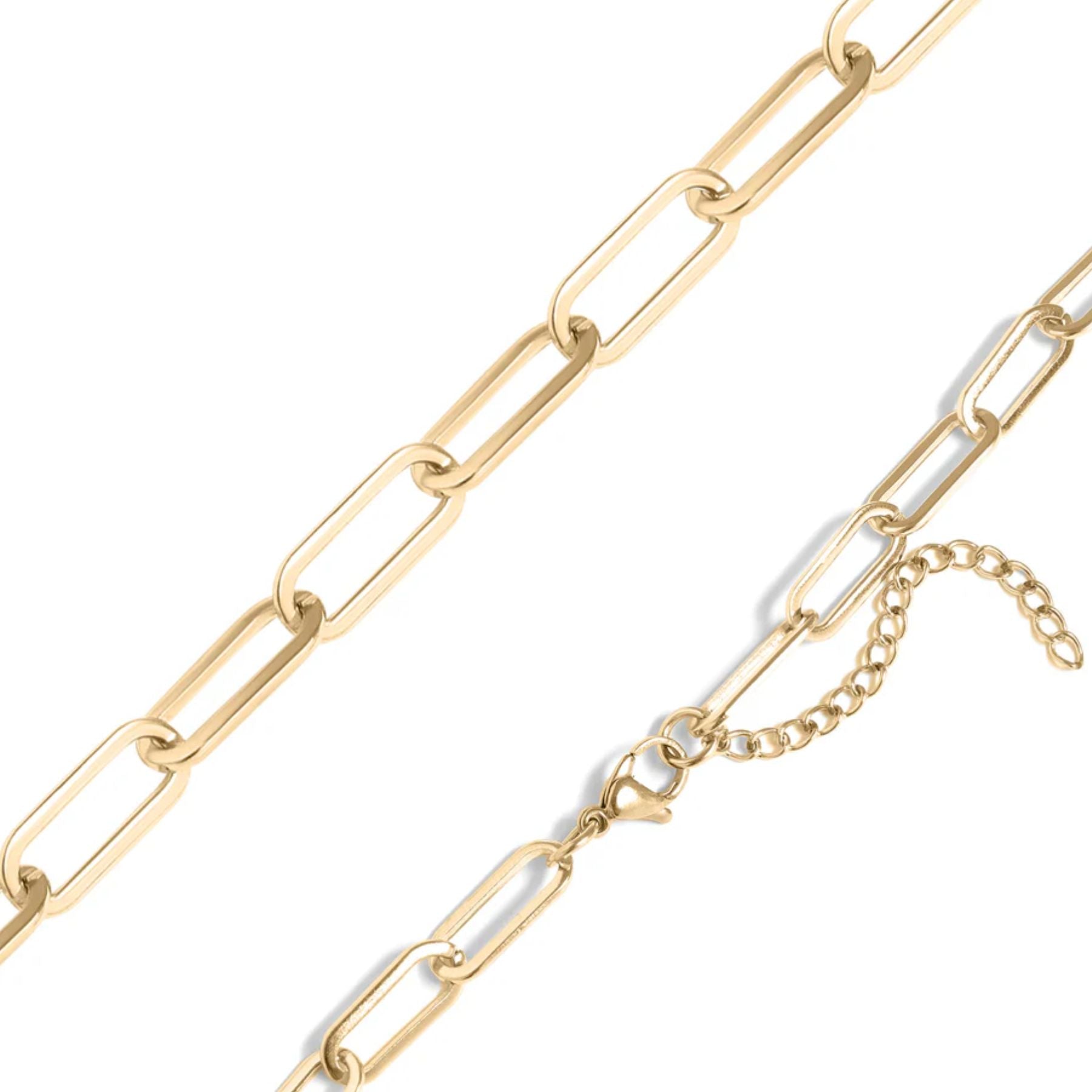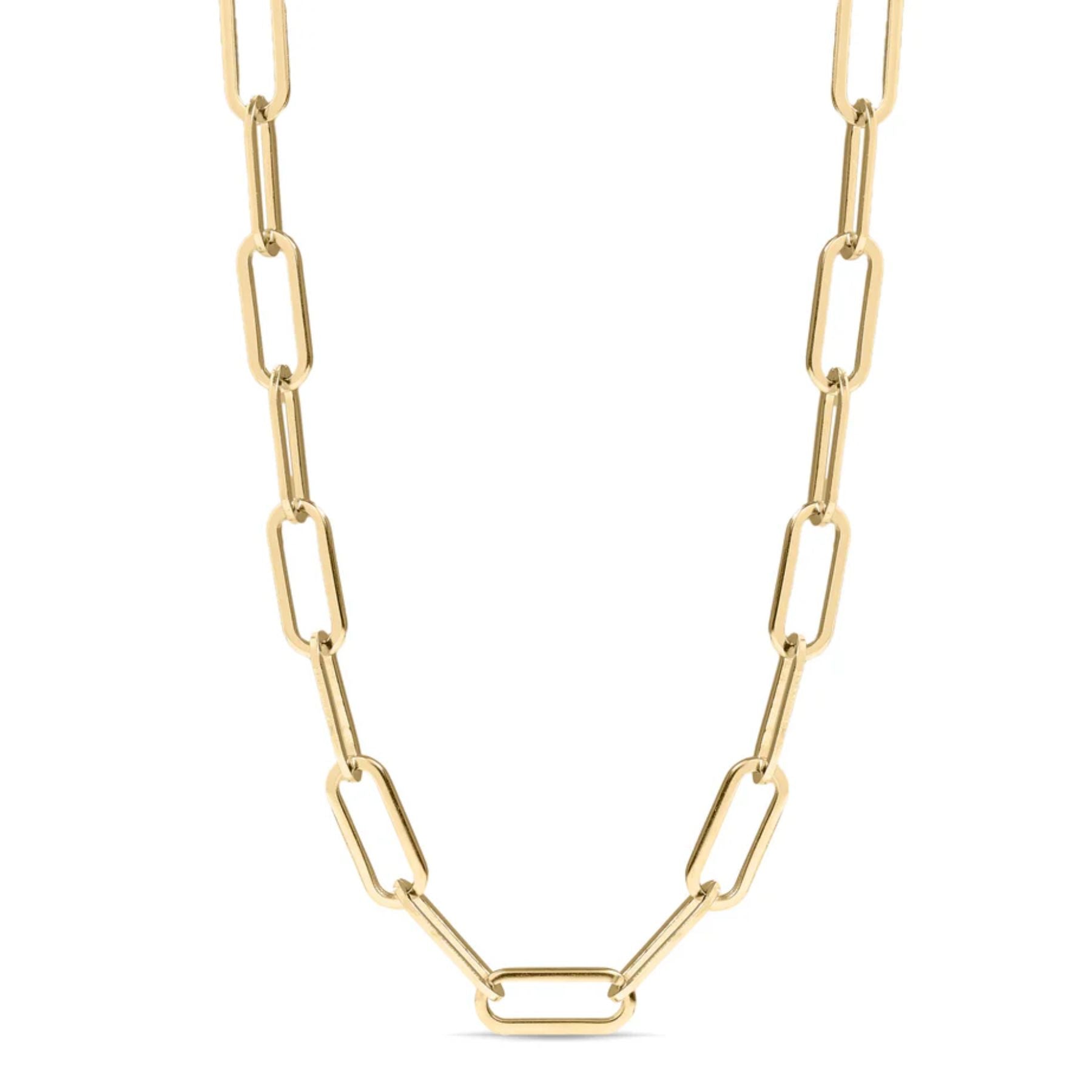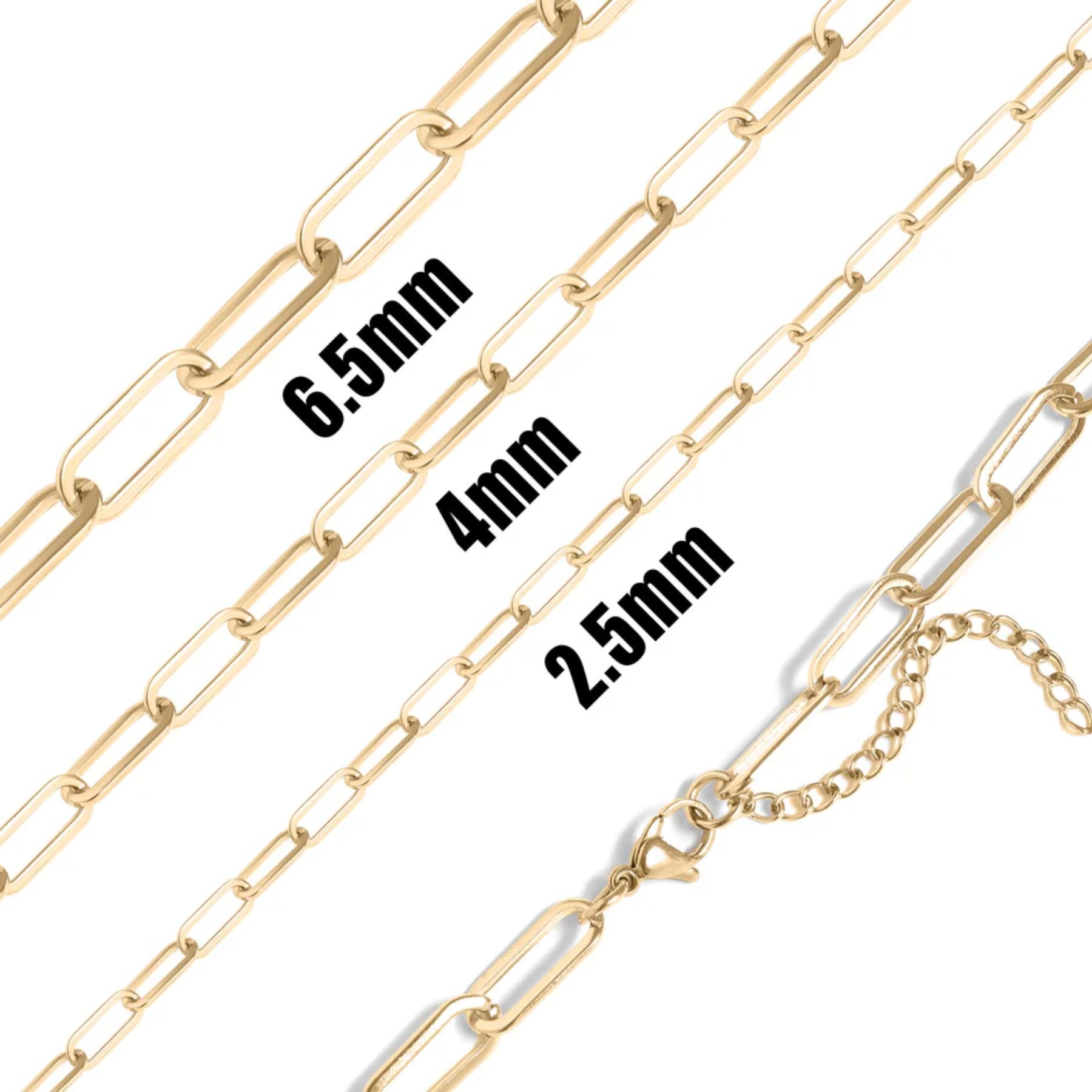 This modern necklace features a new trending chain design using dainty, paper-clip-styled links to form a beautiful and interesting piece. It's a simple, casual necklace you can wear anywhere and with anything, but the best part? It's customizable! You can add your favorite small pendants or charms to bring your own style to this necklace. You even layer them with other delicate chains to create a trendy look.
